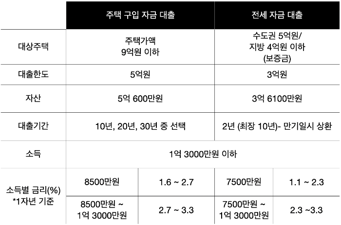 주택 구입자금 대출의 경우 자산 5억600만원 이하, 연 소득 1억3000만원 이하, 연 1.6~3.3% 금리로 최대 5억원까지(주택가액 9억원 이하) 빌려주며 전세자금대출의 경우 자산 3억6100만원 이하, 연 소득 1억3000만원 이하, 연 1.1~3.0% 금리로 최대 3억원까지(보증금 수도권 5억원, 지방 4억원 이하) 빌려줍니다.